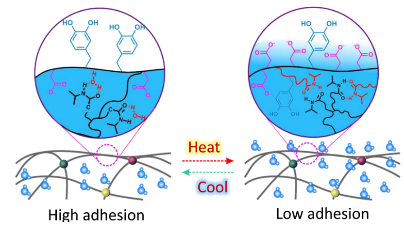這項突破并非一蹴而就。周峰回憶,幾年前,團隊一直攻關高強韌黏附水凝膠材料,偶然發(fā)現一種材料在多次按壓后黏性驟降?!霸摤F象引發(fā)了我們的極大興趣,經過對材料的成分分析、機理驗證等,才知道原來在多次按壓以后,手部溫度傳遞到凝膠表面,致使凝膠發(fā)生相變,呈現低黏附態(tài)?!边@讓團隊意識到,溫度可能是調控黏附性能的鑰匙。