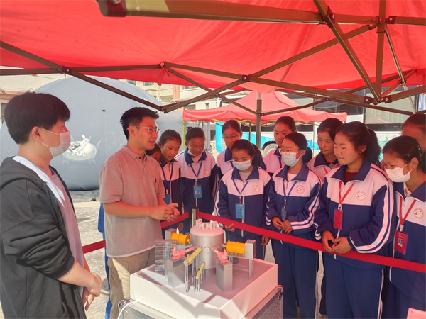 “科學快車”集車廂內(nèi)展廳、戶外可移動展區(qū)、球幕充氣影院為一體,具有即時性強、互動性強、移動性強等特點。各類設(shè)備模型前,同學們流連駐足,仔細觀摩,熱烈討論;互動小實驗時,孩子們踴躍參與,眼睛里充滿好奇與渴望;車廂內(nèi)的互動展廳利用沉浸式環(huán)境和交互式手段,更是讓大家直呼驚奇,在參與中體驗神奇的科技世界。