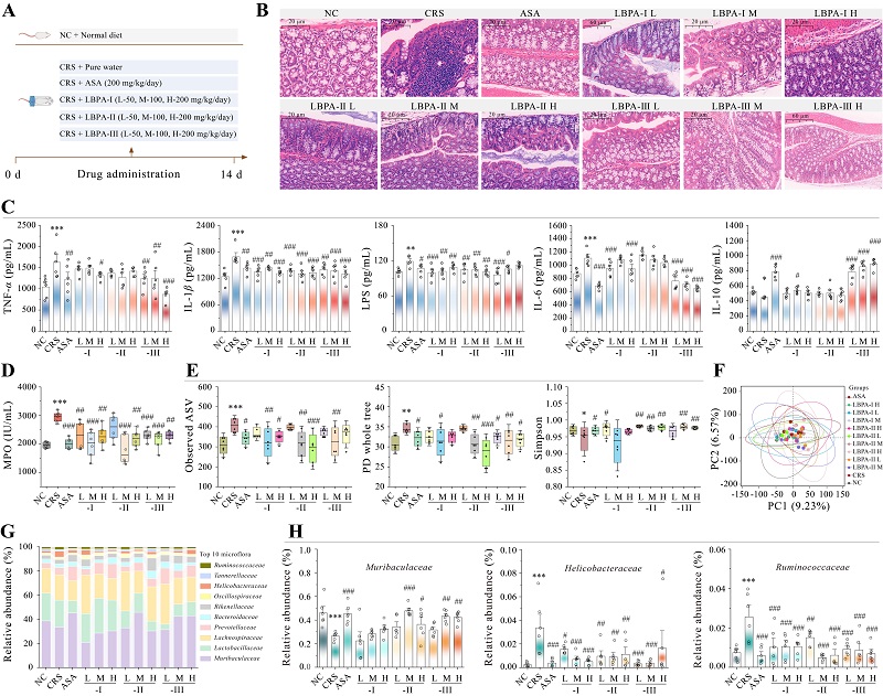 在慢性束縛壓力誘導的小鼠腸道炎癥模型中,活性最優(yōu)的果膠組分(LBPA-III,100 mg/kg.bw)可顯著減輕結腸組織損傷,恢復細胞因子平衡(如TNF-α水平降低、白介素IL-10水平升高),并抑制中性粒細胞浸潤。機制層面,LBPA-III通過重塑腸道菌群結構(如降低Helicobacteraceae豐度、升高Muribaculaceae豐度)、下調促炎脂質代謝物(如1,2-dierucoyl-PE)水平,以及調控內源性大麻素系統(tǒng)(如CB2水平升高、FAAH水平降低)發(fā)揮抗炎作用。上述研究揭示,枸杞果膠AG-II與RG-I–AG-II這種獨特的結構范式,通過“超分子偽降解”機制協(xié)同調控腸道菌群,并激活“腸道菌群-代謝物-內源性大麻素系統(tǒng)”軸,從而高效抑制腸道炎癥。