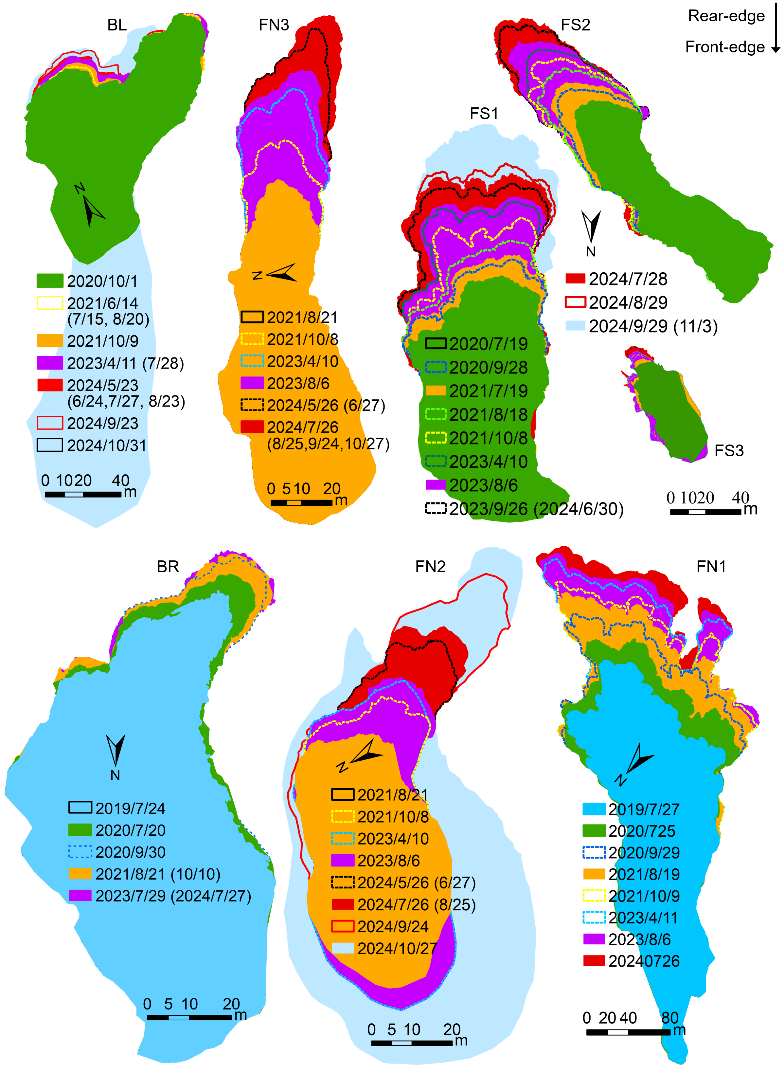 2019-2024年間,研究區(qū)熱融滑塌整體呈持續(xù)擴(kuò)張趨勢(shì),活動(dòng)期集中在每年6~10月,其中9-10月最為劇烈;滑塌面積年均擴(kuò)張約1182.9平方米,月均擴(kuò)張約505.7平方米,其后緣后壁年均后退14.5米,月均后退6.2米。同時(shí),研究精準(zhǔn)量化了滑塌體內(nèi)部地表物質(zhì)的運(yùn)動(dòng)速率,明確了該速率自后緣向前緣呈遞減規(guī)律,揭示了后緣后退與下坡物質(zhì)搬運(yùn)之間的緊密力學(xué)關(guān)聯(lián)。