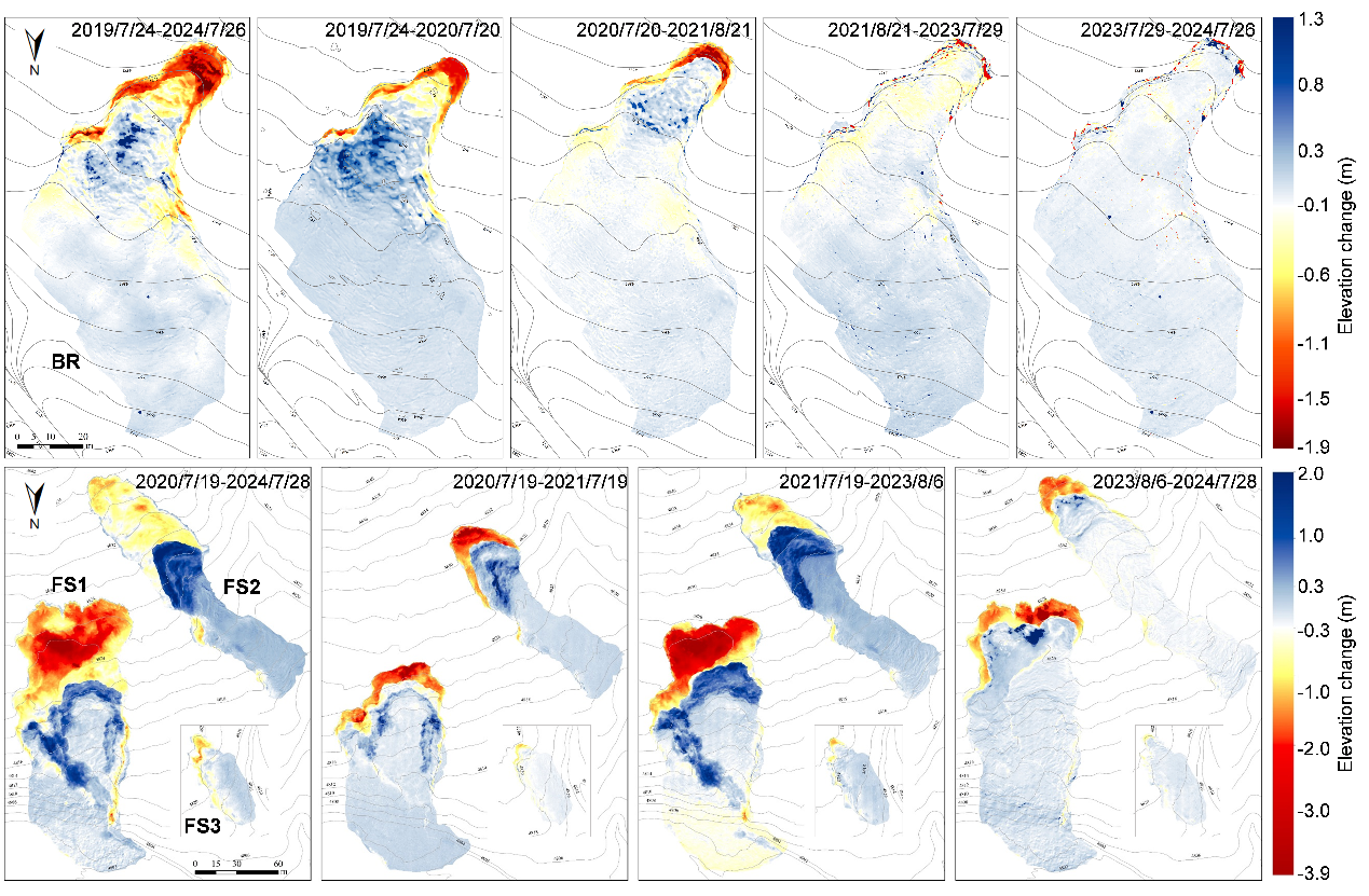 研究實(shí)現(xiàn)了對(duì)小尺度熱融滑塌四維時(shí)空動(dòng)態(tài)演變的精確量化,獲取了高精度的滑塌面積擴(kuò)張、后緣后退、地表物質(zhì)運(yùn)動(dòng)和體積變化等核心參數(shù),明確了青藏高原熱融滑塌月度、年度和總體變化特征,深化了對(duì)其內(nèi)部物質(zhì)遷移和擴(kuò)張過(guò)程的認(rèn)識(shí),為青藏高原多年凍土區(qū)熱融滑塌的碳動(dòng)態(tài)評(píng)估及工程走廊基礎(chǔ)設(shè)施安全提供了關(guān)鍵科學(xué)依據(jù)。