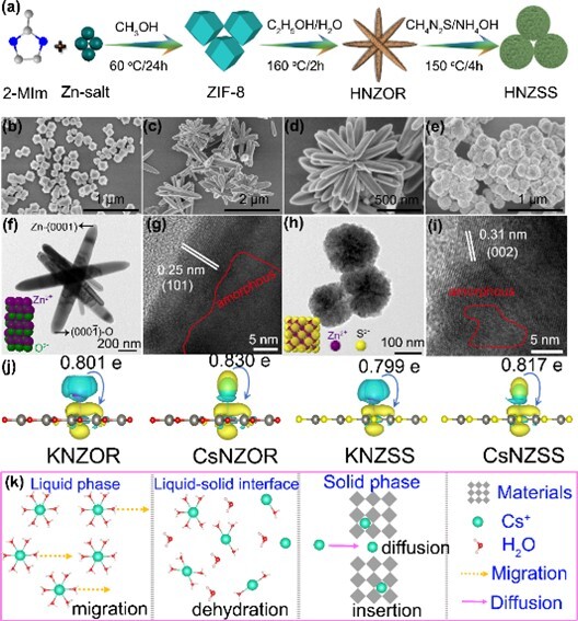 基于上述策略,將十二面體ZIF-8定向轉化為無碳氮摻雜氧化鋅棒(HNZOR),并進一步將其轉化為硫化鋅球(HNZSS)。與傳統(tǒng)煅燒方法相比,該方法有效抑制了金屬團聚,充分暴露活性位點,并形成了具有高表面積的非晶區(qū)域(HNZOR為203.9 m2/g,HNZSS為61.7 m2/g)。這些特性協(xié)同增強了傳質能力,并在吸附劑骨架中形成強結合力,從而實現(xiàn)了優(yōu)異的吸附性能。K?活化后的吸附劑(KNZOR和KZNSS)展現(xiàn)出快速吸附動力學和高吸附容量(分別為275 mg/g和302 mg/g),克服了競爭離子干擾,在復雜環(huán)境中對Cs?具有優(yōu)異的選擇性。在實際水樣中,它們表現(xiàn)出卓越的吸附效率,KNZOR和KZNSS的分配系數(Kd)分別達到2061.85 mL/g和2578.31 mL/g。在實際柱操作中,KNZOR和KZNSS在連續(xù)流條件下可實現(xiàn)近定量(約99%)的Cs?回收。研究結果以“In-situ sequential topotactic transformation of ZIF-8 to N-doped Zn-oxide/ sulfide with defect engineering for efficient radiocesium capture” 為題發(fā)表于Chem. Eng. J.(一區(qū)TOP)。